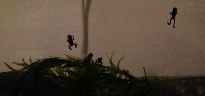 Thuis stopte ik het viertal in een pan met glazen deksel, een klein laagje water op de bodem. Ik moet een aquarium kopen, of tenminste een emmer, dacht ik terwijl ik op de fiets sprong en naar de dichtstbijzijnde dierenwinkel snelde. Toen ik thuiskwam met een grote doorschijnende plastic bak, zaten er nog maar drie kikkertjes in de pan. Zouden ze de vierde opgegeten hebben? Pas enkele uren later hopte nummer vier te voorschijn, ergens vanuit een hoekje in de kamer. Hij moet zich door het kleine tuitje om af te gieten heen hebben gemanoeuvreerd.